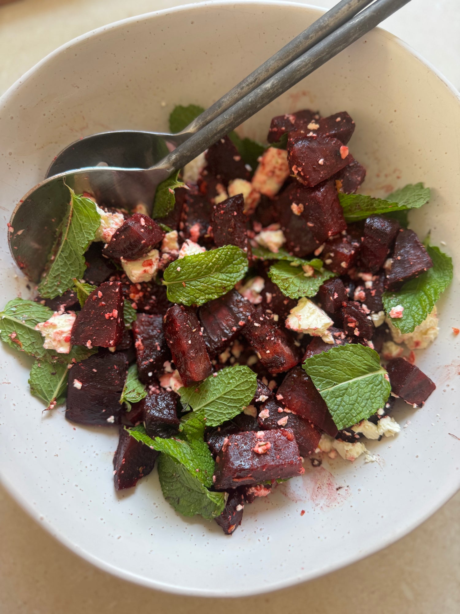 Roasted beetroot tossed in Maple Co Ciao Bella, finished with creamy feta, fresh mint, and bright lemon zest for a beautifully balanced, earthy-fresh salad.